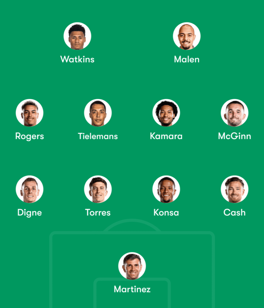 Villa’s Ollie Watkins has struggled so far this season. I expect Unai Emery to try to bolster his attack in this match by starting both Watkins and Donyell Malen, while also including attack-minded Morgan Rogers in the lineup. Amadou Onana could start ahead of Boubacar Kamara or Youri Tielemans for rotation purposes, but with Kamara and Tielemans playing well, I am opting for the pair to once again start in midfield.