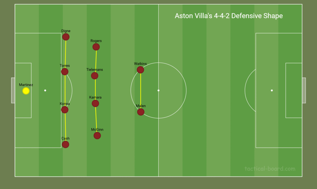 Aston Villa defend in a 4-4-2 shape with a flat midfield four. Villa’s back line defends with width, while their midfield line defends with a more narrow approach. [See image below]