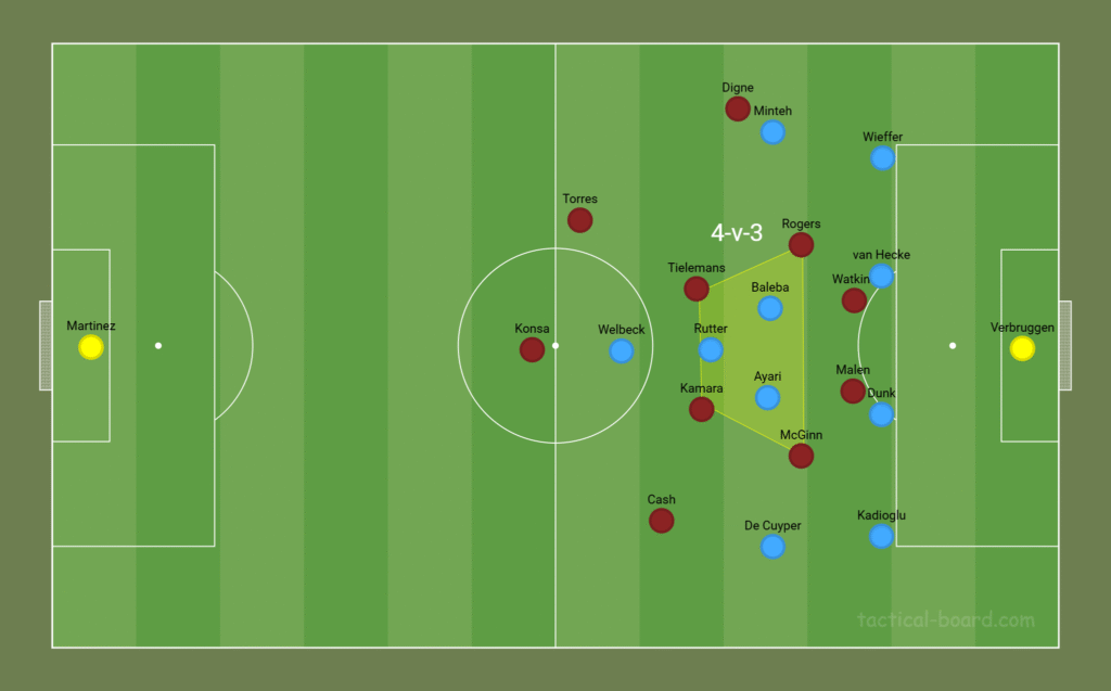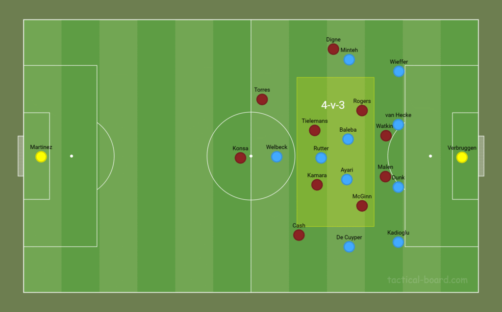 Brighton’s midfield trio will look to outnumber Villa centrally when progressing the ball and when Brighton have possession in Villa’s half. [See image below]