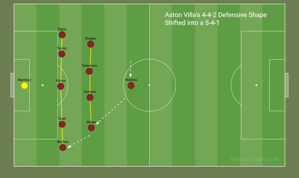 Villa’s defensive shape transitions when needed into a 5-4-1, with the outside midfielder dropping into the back line to form a line of five, while the secondary striker drops deeper into the midfield line. [See image below]