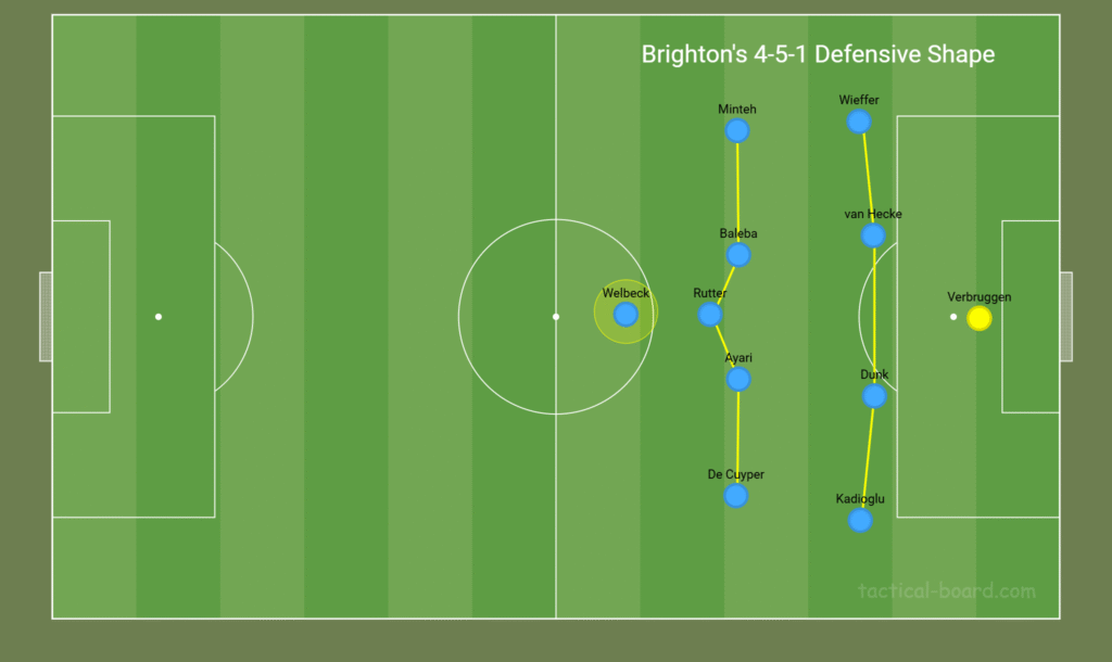 Brighton’s defensive shape is that of a 4-5-1 with their wingers dropping into the midfield line. [See image below]