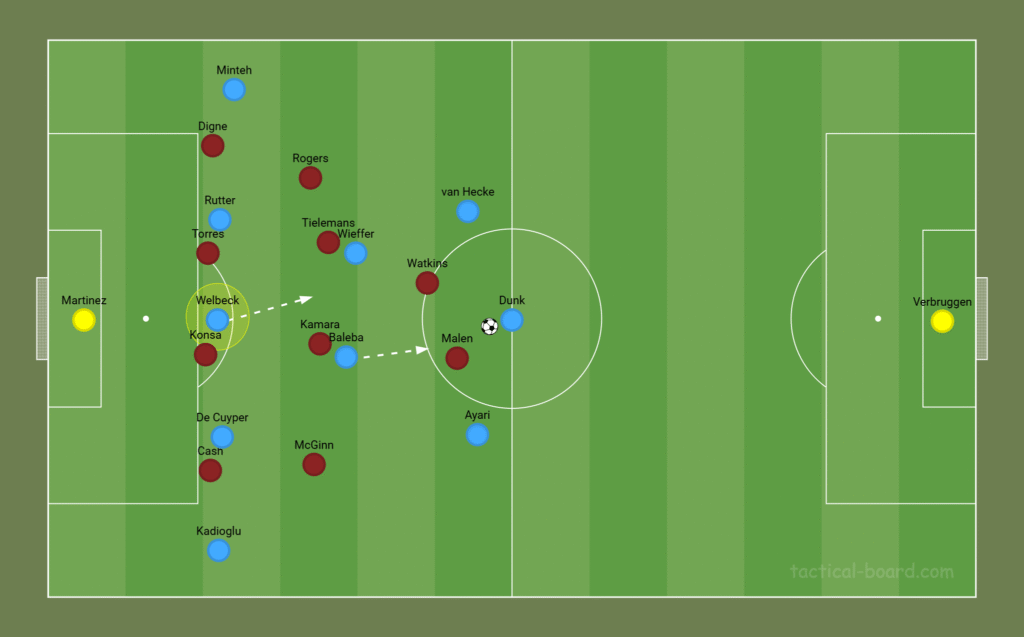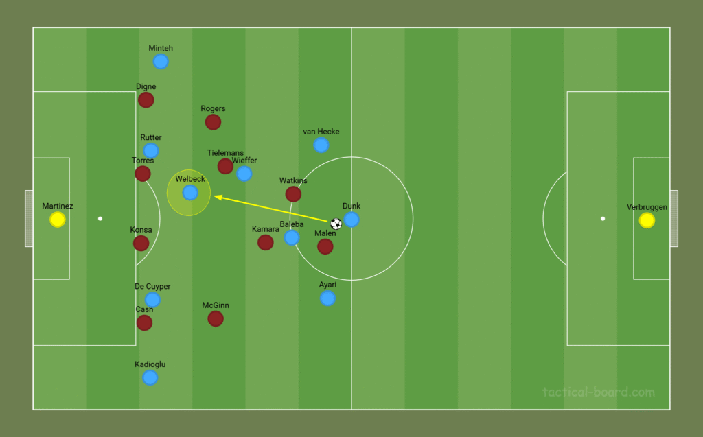 At times, Aston Villa can also be caught with only two defenders when both Digne and Matty Cash push forward. If possession is won while Villa’s full-backs are high, Danny Welbeck will drop into the space in front of Villa’s defenders to receive before linking play for his wingers or attacking midfielder running beyond.