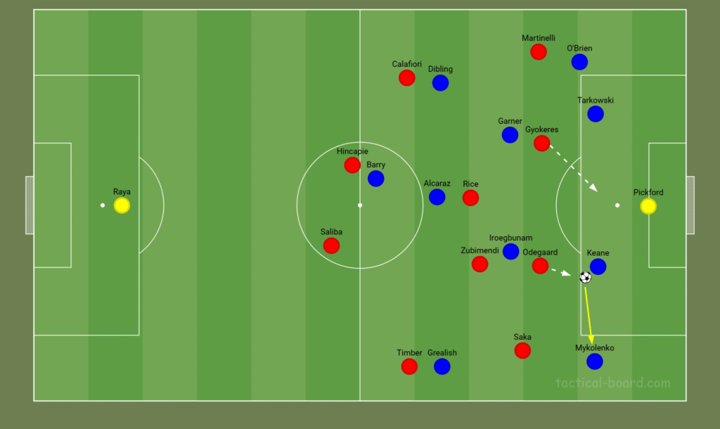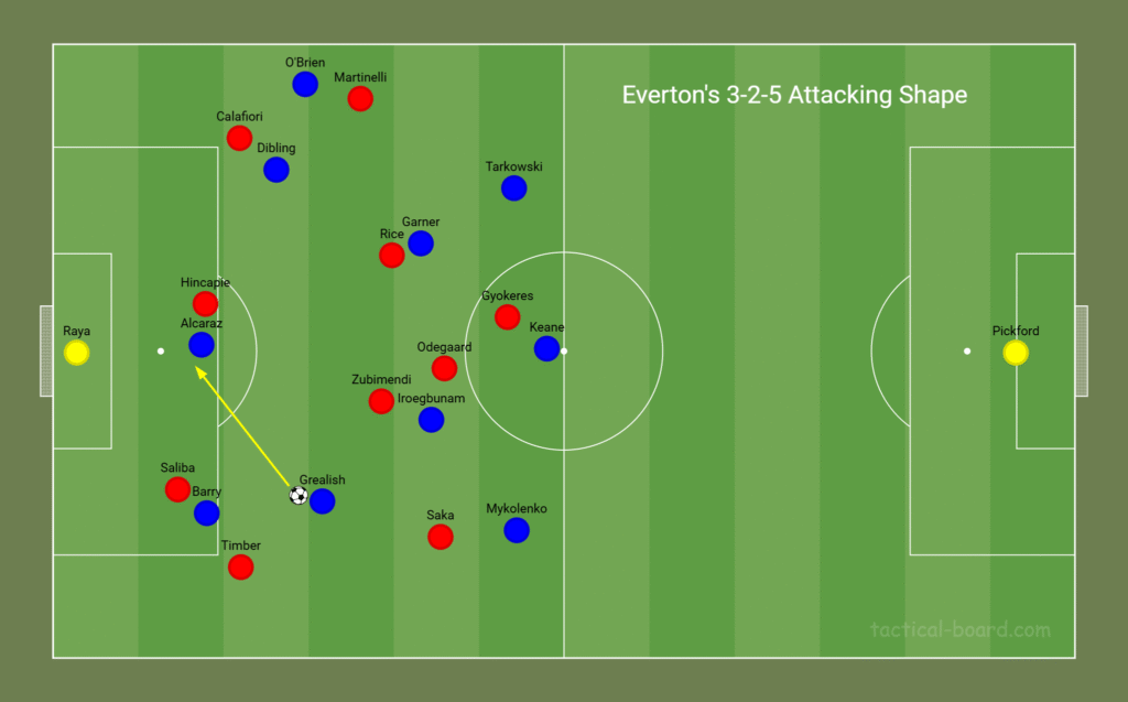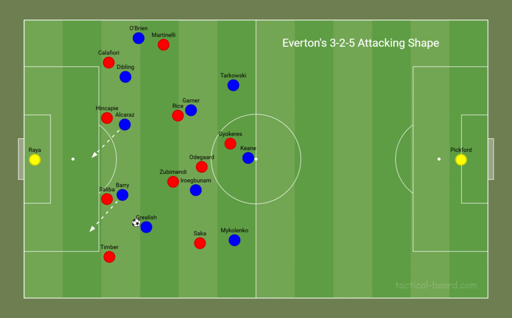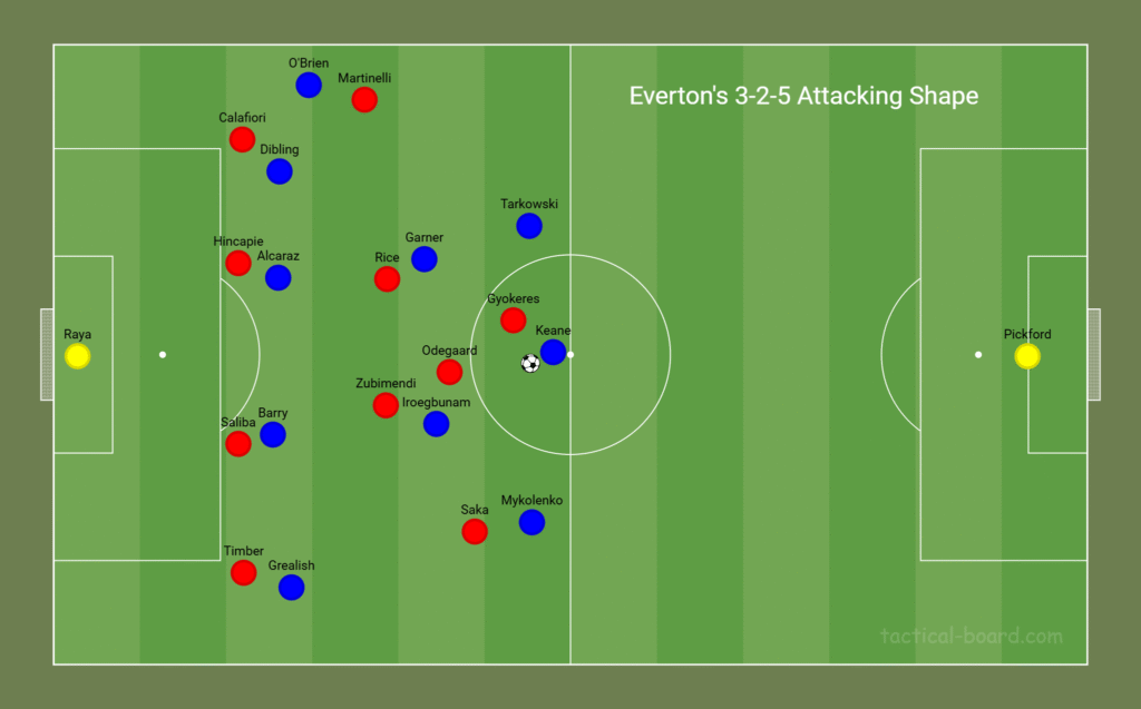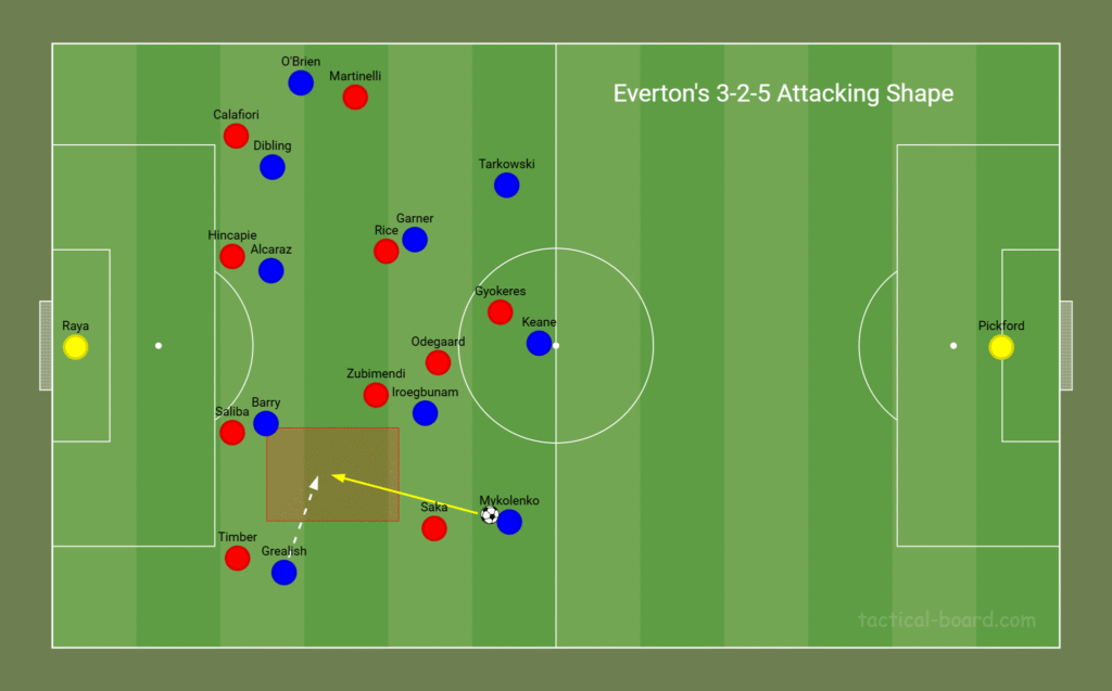 Everton having an attacking line of five with O’Brien pushing high and wide will either draw Arsenal’s left winger deeper in defensive duties or force Zubimendi or Rice to drop in with the back line.