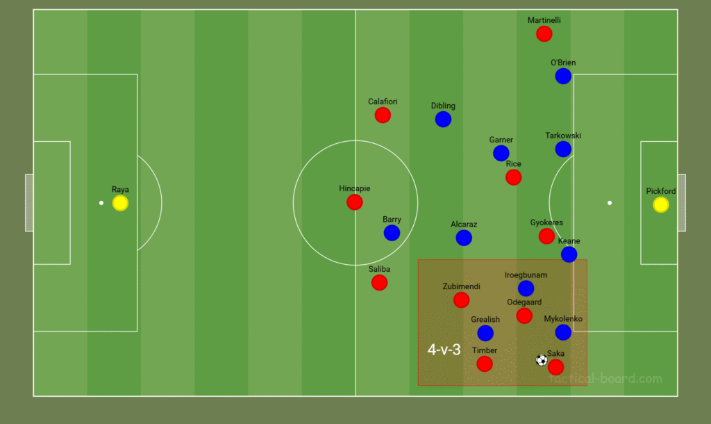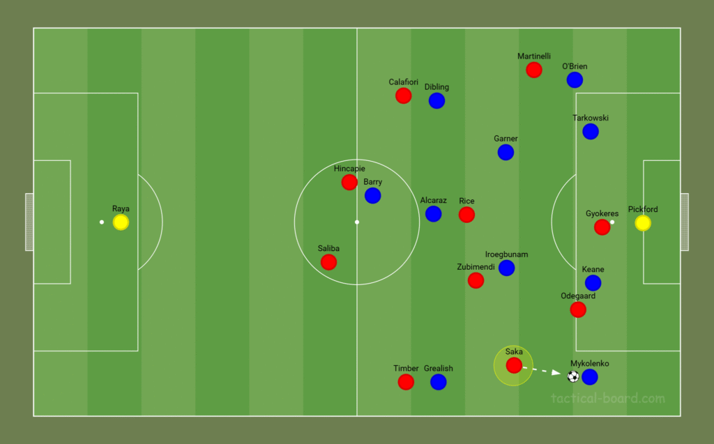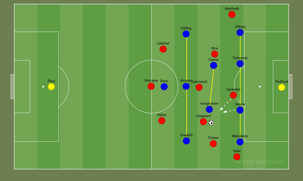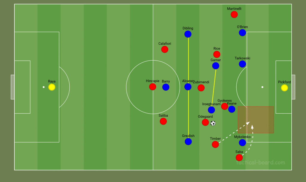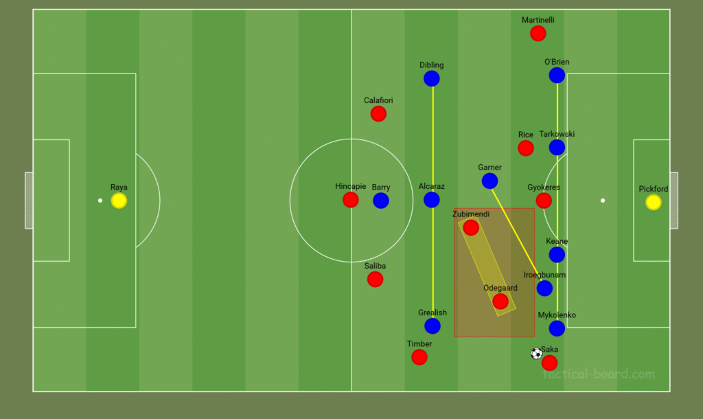 Everton having an attacking line of five with O’Brien pushing high and wide will either draw Arsenal’s left winger deeper in defensive duties or force Zubimendi or Rice to drop in with the back line.