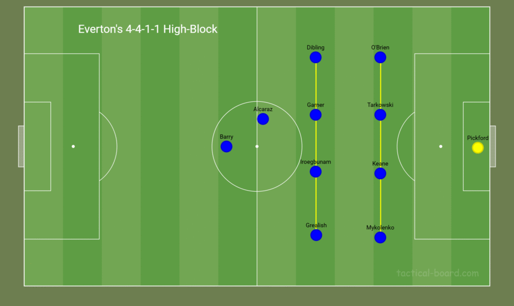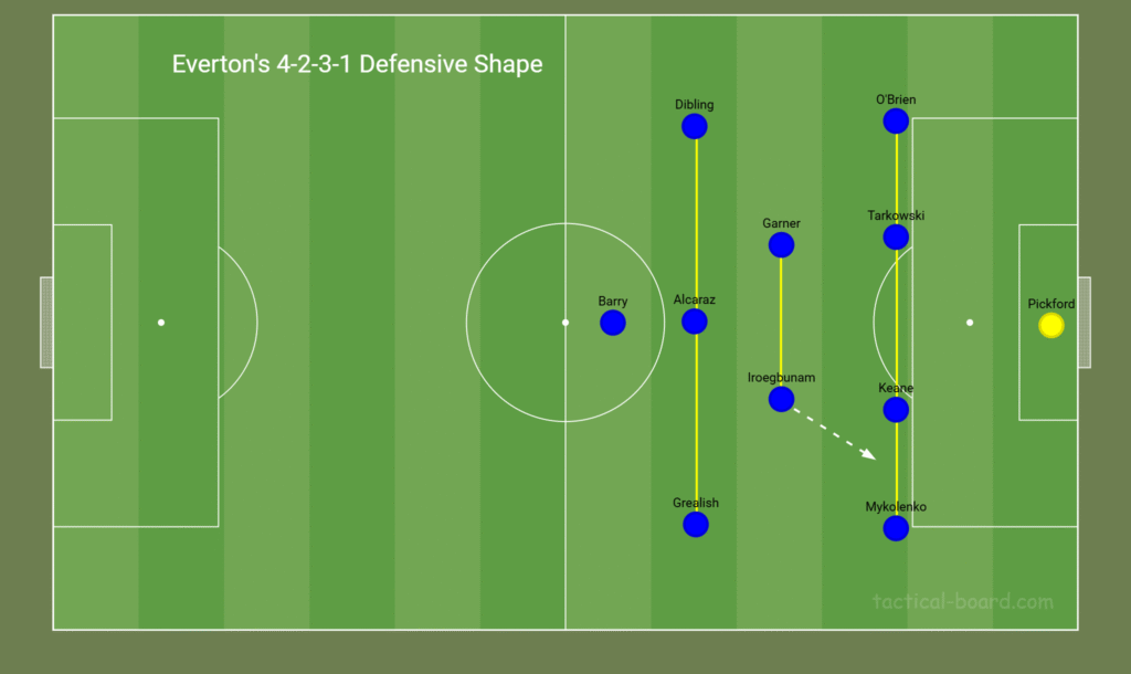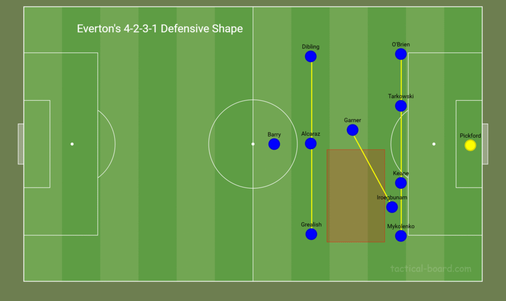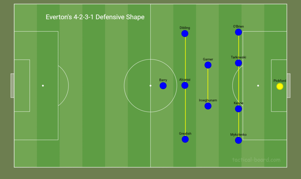 Out of possession, Everton typically operate in either a 4-2-3-1 shape or a 4-4-1-1 when they are looking to push their opposition back and defend in a higher block. [See images below]