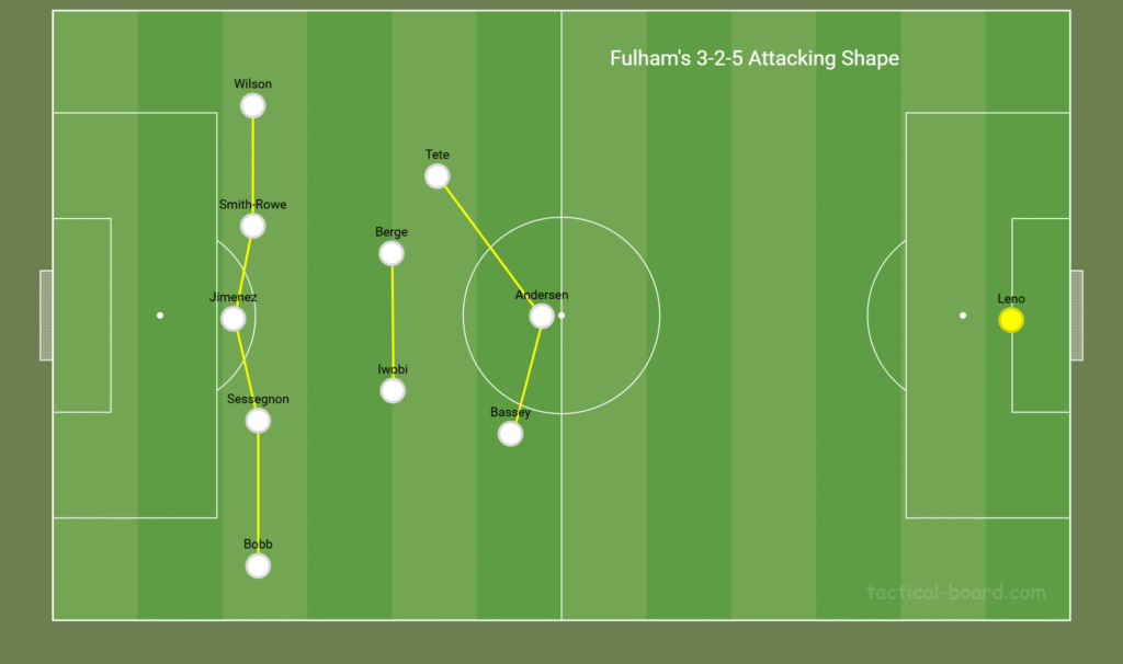 In attack, Fulham – like Tottenham – often transition into a 3-2-5 shape, with Ryan Sessegnon joining the attack from full-back.