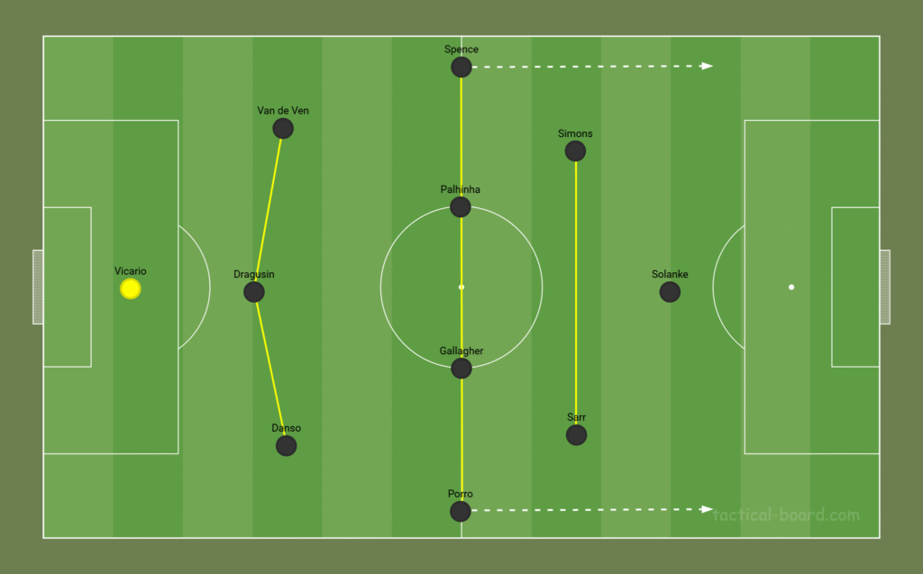 Micky Van de Ven will be a key component in Tottenham’s build-up, as the Dutch centre-back possesses the ability to carry the ball forward with line-breaking, progressive runs. João Palhinha is likely to be tasked with covering for Van de Ven when he advances.