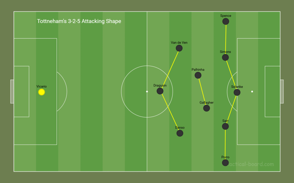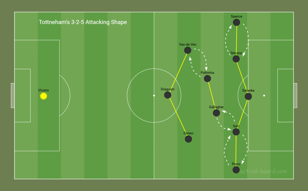 When going forward under Igor Tudor, Tottenham’s ultimate goal is to create a very fluid 3-2-5 attacking shape with the wingbacks, 10s, and outside centre backs playing key roles with their movement and rotations.