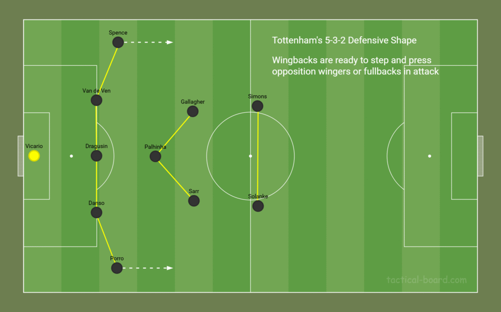 Against Arsenal, Spurs lined up in a 5-3-2 shape out of possession. Their wing-backs dropped to form a back five, Xavi Simons stepped up to join Randal Kolo Muani in a front two, and Conor Gallagher dropped from his No. 10 position into midfield.