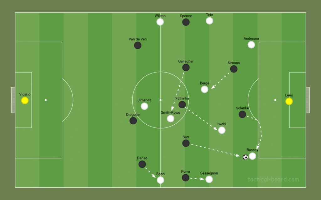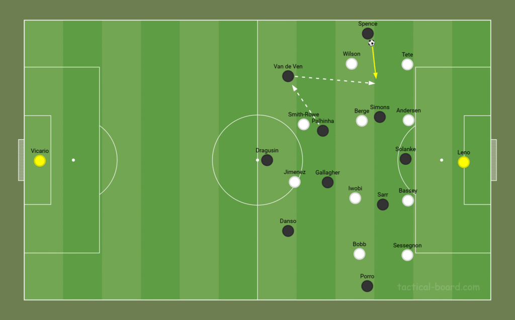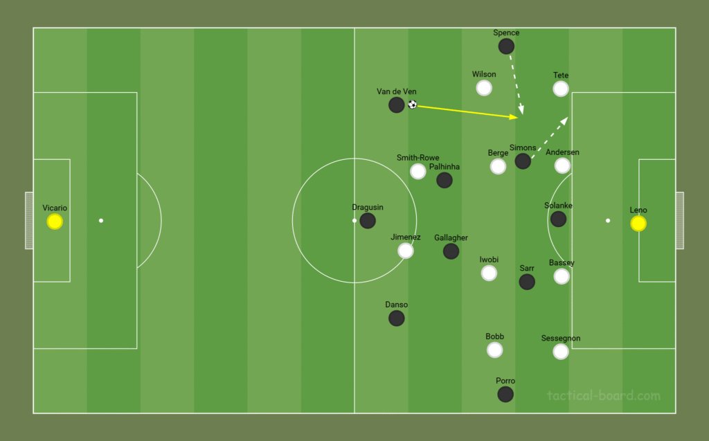 On multiple occasions, Bukayo Saka and Jurriën Timber were able to pull Spurs defenders out of position and exploit the resulting gaps. Fulham should look to use their wingers and full-backs in a similar fashion to manipulate Tottenham’s defensive line.
