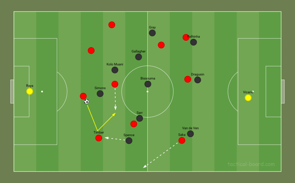 In one example, Tottenham attempted to press after transitioning from their 5-3-2 defensive shape into a 3-5-2 pressing structure, with Djed Spence stepping up to press Timber. Saka drifted wide toward the touchline, drawing Van de Ven with him.
