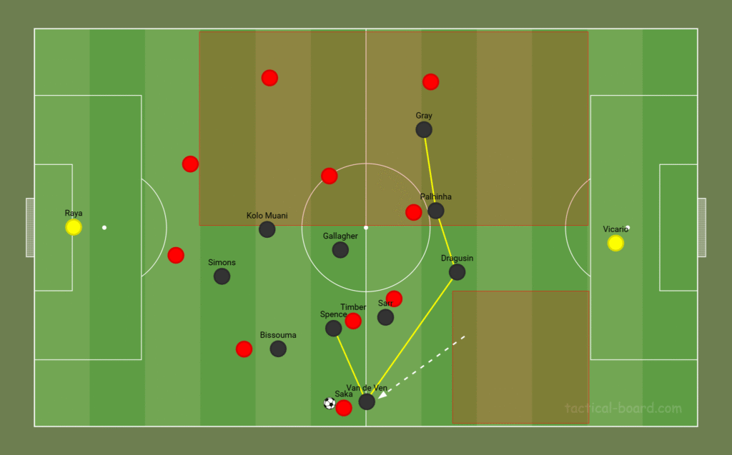 When Van de Ven tracked Saka and Spence man-marked Timber, Tottenham’s left defensive channel became exposed. With the entire Spurs shape shifted toward one side, the far side of the pitch was left open for a quick switch of play, allowing Arsenal to advance with a numerical advantage.