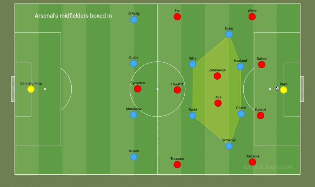 When operating in this 4-2-4 high pressing shape, Doku and Semenyo will look to position themselves more narrow, looking to congest the central areas of the pitch and box in Arsenal’s holding midfielders of Rice and Zubimendi.