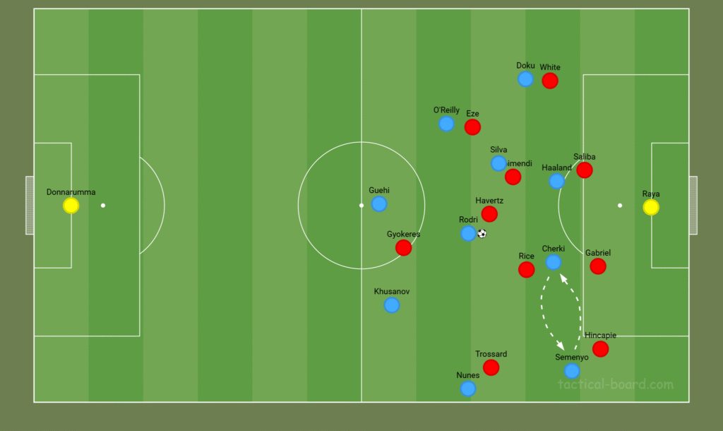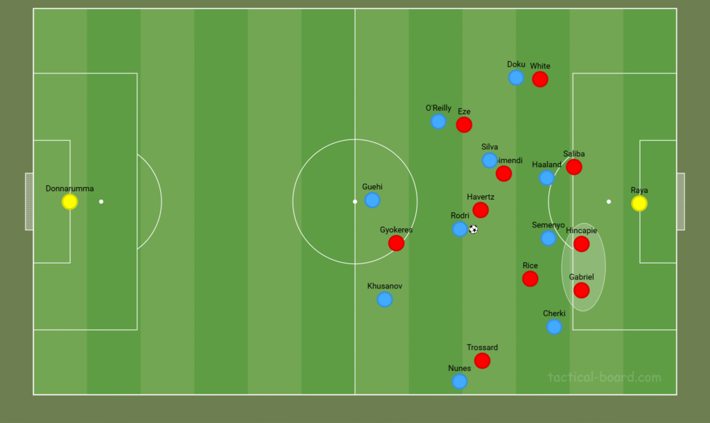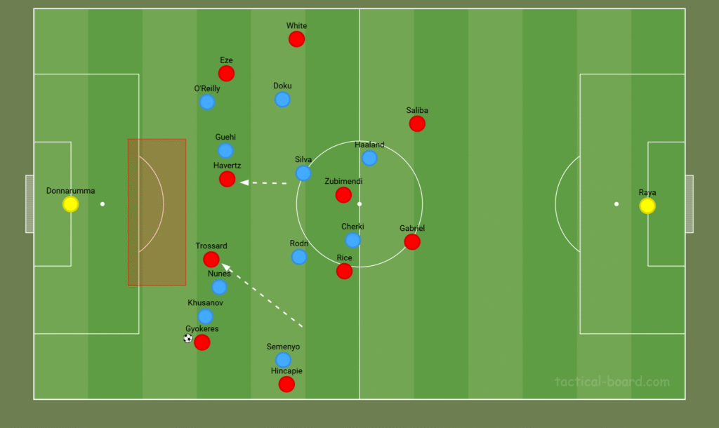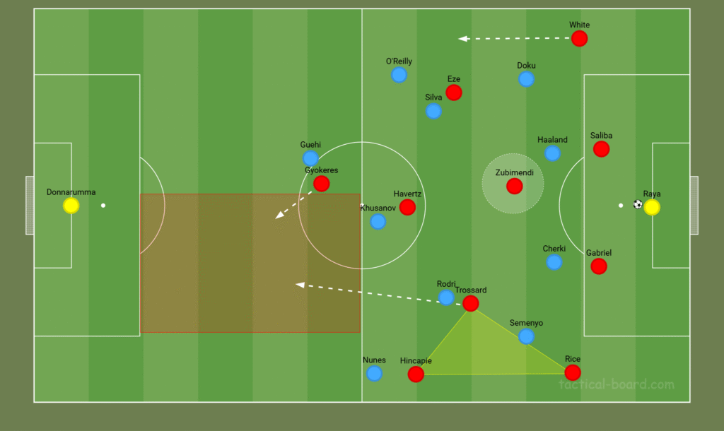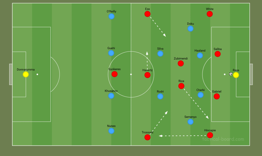 On the left, Leandro Trossard could mirror this movement, drawing Rodri out of position, while Hincapié advances down the flank. Declan Rice may drop into the back line to cover, forcing City’s wide players to hold their positions and potentially opening space centrally.