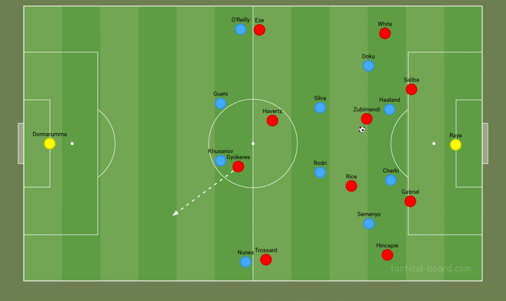 Arsenal’s right winger (Eze) could look to invert in from the outside lane and drop between Silva and Doku, looking to drag City’s Bernardo Silva out of the central spaces to mark him. Along with Silva potentially being dragged out of position, City’s right back (O’Reilly) could be dragged higher up the pitch.