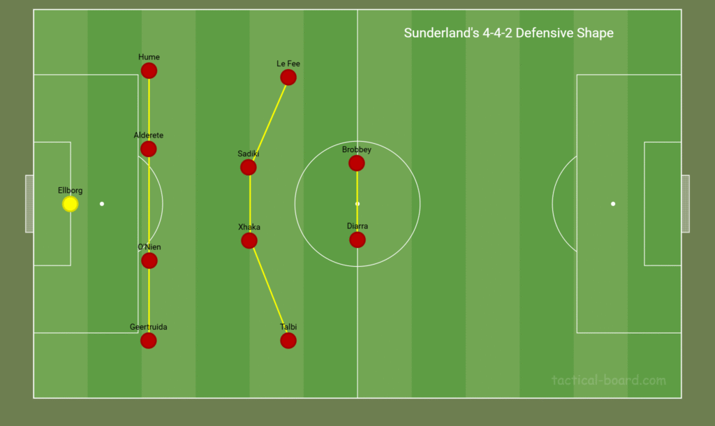 Out of possession, Sunderland can adopt one of two defensive shapes. At times, they maintain a traditional 4-2-3-1, with their midfielders and wingers positioned narrowly to protect central areas.