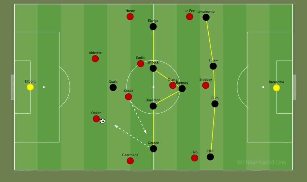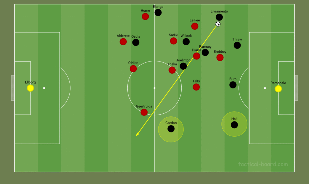 Sunderland possess several players who are capable of roaming and dropping into pockets of space between the opposition’s lines, most notably Brian Brobbey, Sadiki, and Diarra. Newcastle must remain compact centrally, ensuring they do not become stretched vertically while maintaining discipline when tracking runners.
