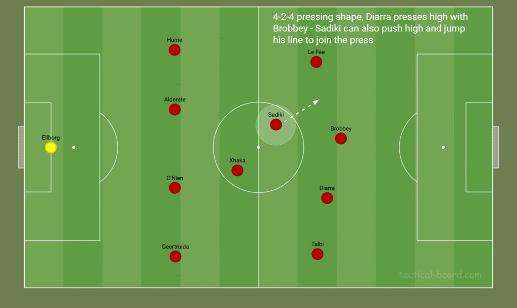 Sadiki’s role within the press can vary depending on the situation. He may step forward to join the pressing line and compress the opposition’s shape, or he may be tasked with tightly marking the opposition’s deepest midfielder. In these scenarios, Granit Xhaka will often rotate centrally to provide additional defensive stability.