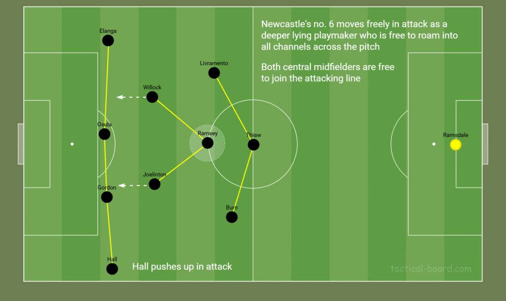 In attack, Newcastle operate in a 3-3-4 shape, with their midfielders ready to push forward and join the front line when opportunities arise.