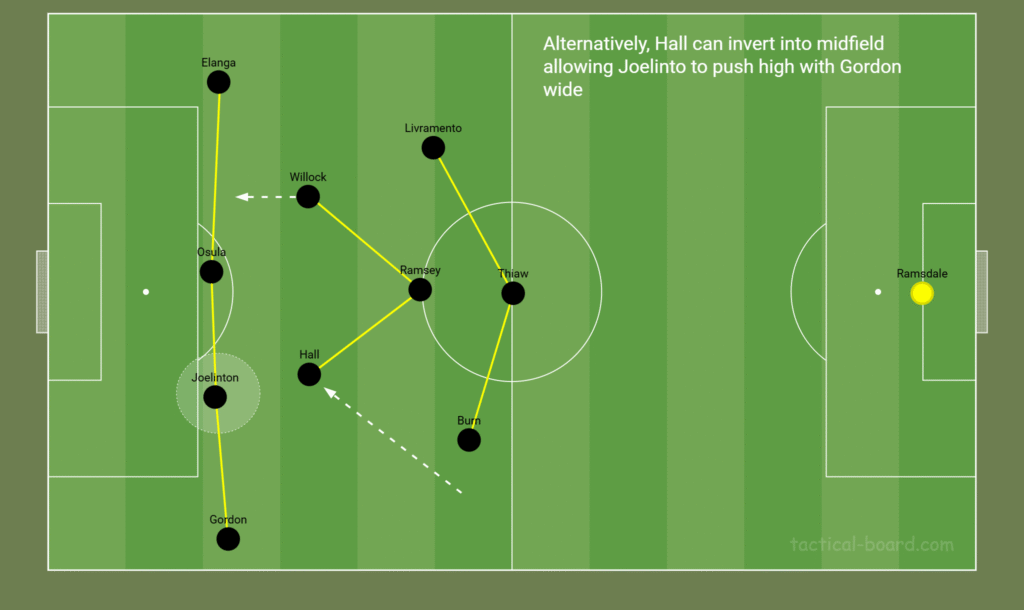 The midfield three stays narrow, with the No. 6 ready to drop into pockets of space between the lines when required. This role is usually occupied by Sandro Tonali, but with the Italian likely unavailable, Jacob Ramsey is expected to fill in as the deeper-lying midfielder.