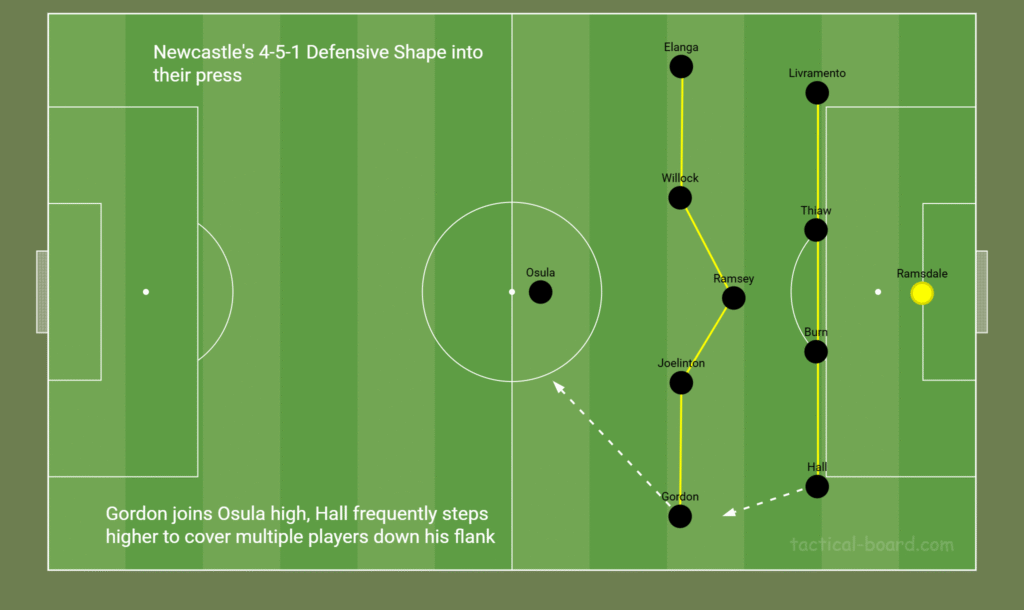 Newcastle frequently press high up the pitch. From their 4-5-1 defensive shape, one winger, often Anthony Gordon, will push forward to join William Osula in the first line of the press.