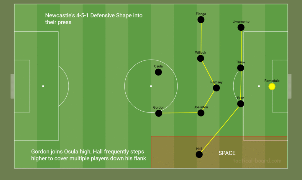 Out of possession, Newcastle drop into a 4-5-1 shape, with their wingers falling back into wide midfield positions. When defending in their own half, they look to remain compact and disciplined.