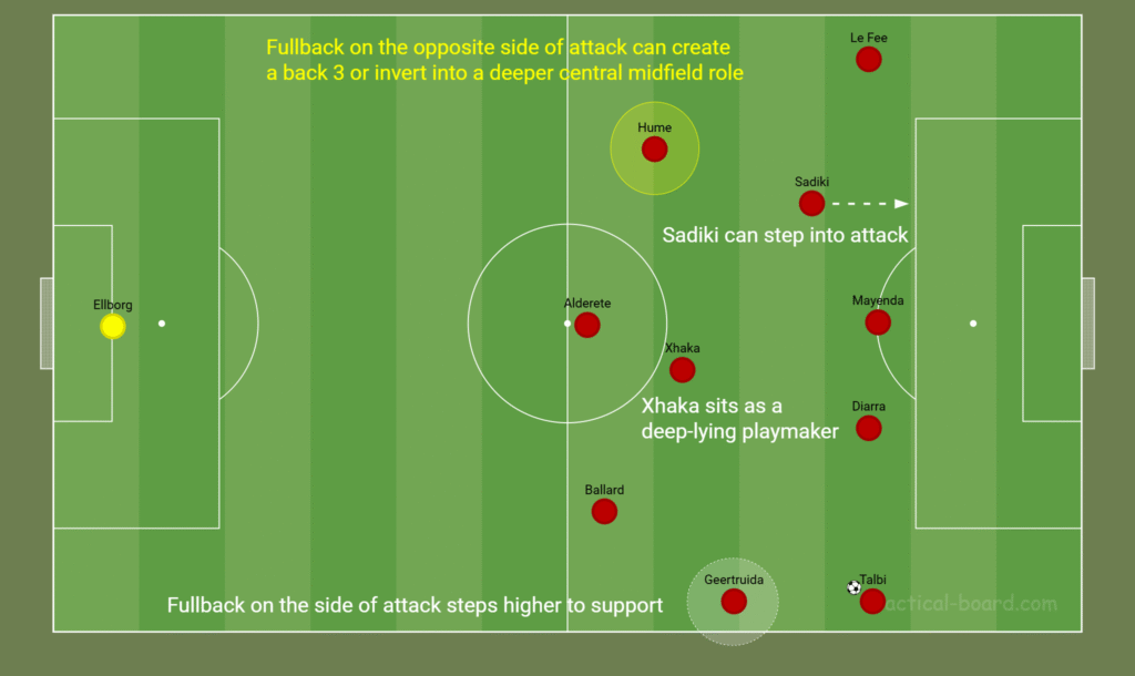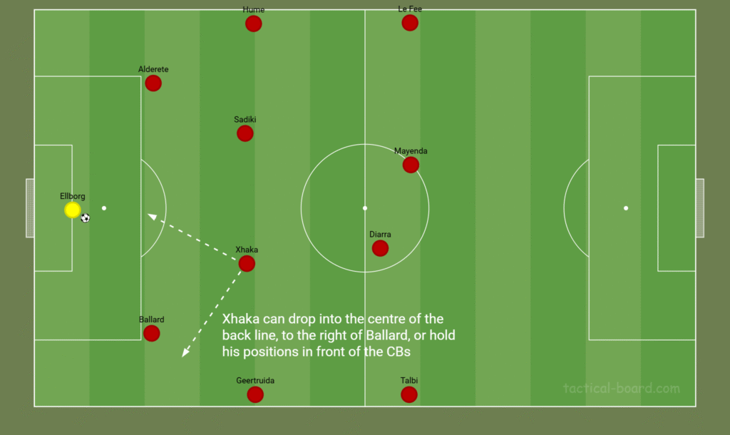 From the double pivot, one midfielder – typically Granit Xhaka – may hold position in front of the defence, while the centre-backs narrow slightly to aid ball circulation. Alternatively, Xhaka can drop into the defensive line, positioning himself to either side of a centre-back to help progress play from deeper areas.