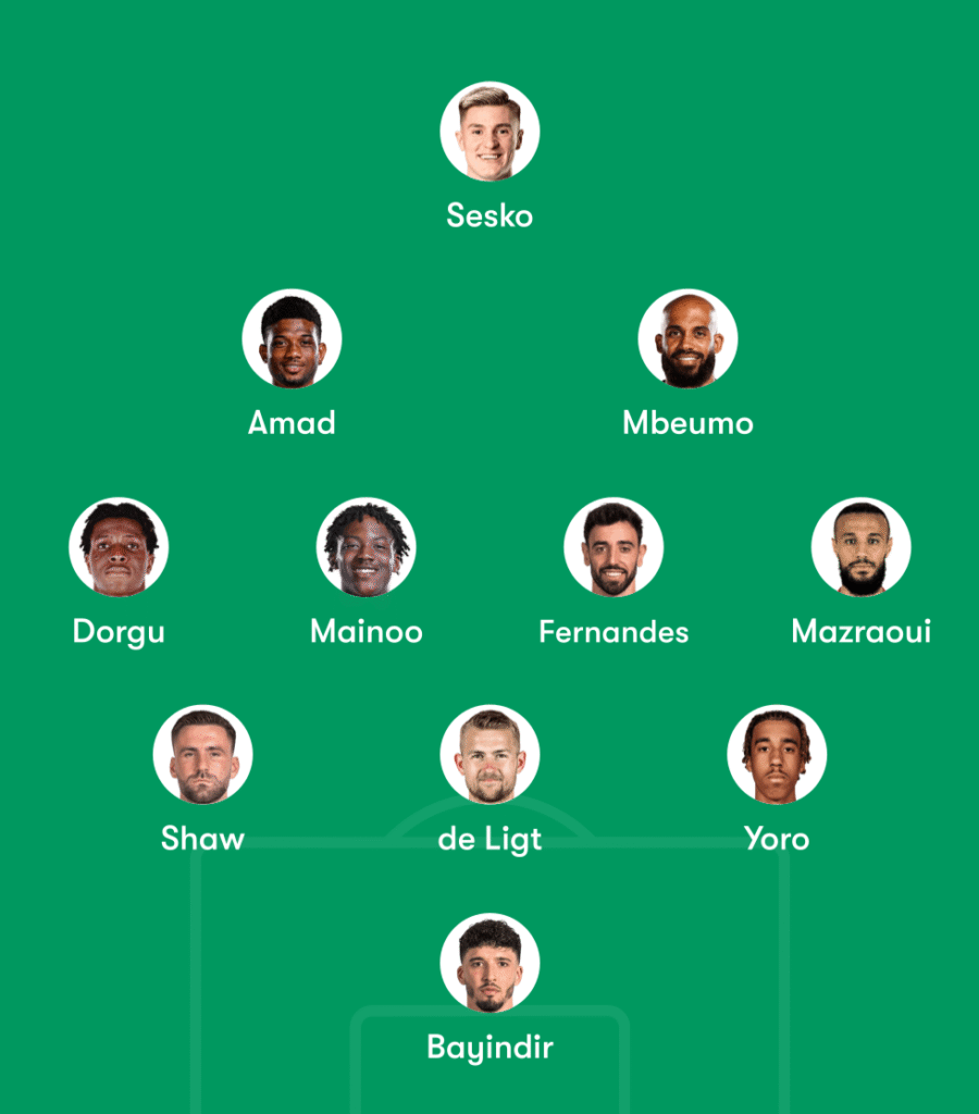 With Mount, Cunha, and Dalot still sidelined for now, I see Šeško returning to Manchester United’s starting lineup and Dorgu reclaiming the left-hand side. I have Kobbie Mainoo stepping into midfield, though the experience of Casemiro could be utilized if Mainoo does not start.