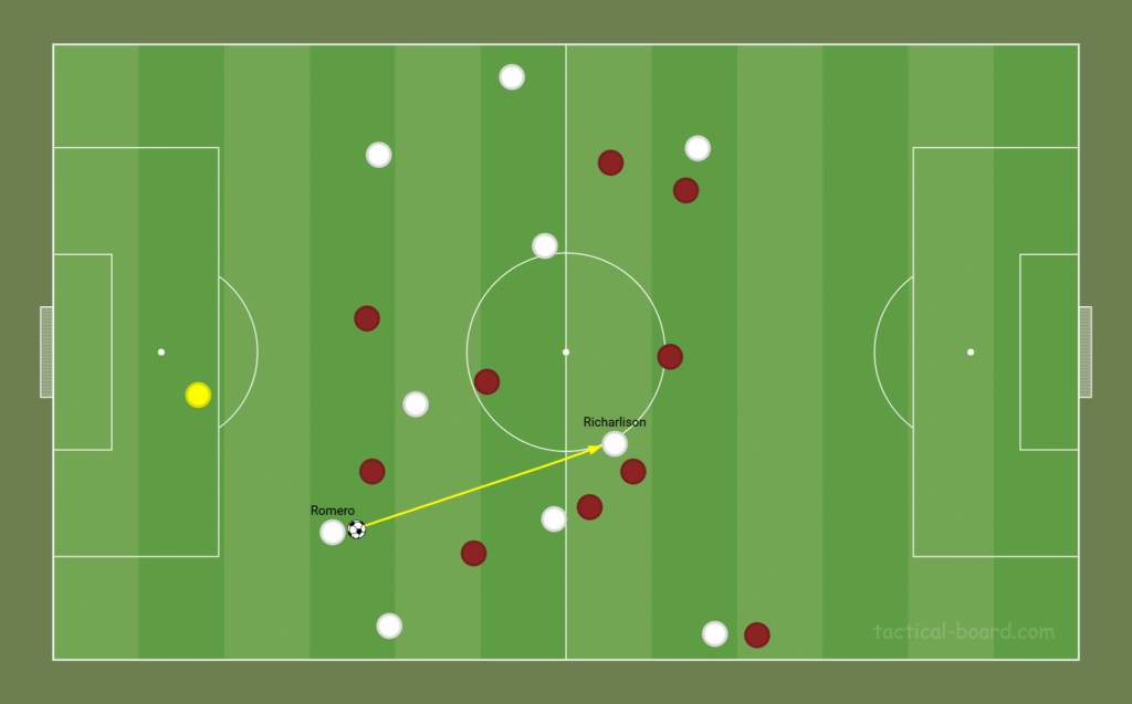 Much of Spurs’ build-up and progression came through the flanks rather than centrally through midfield. Their secondary route was more direct, using Vicario or the defensive line to bypass Burnley’s press with line-breaking passes into Richarlison, who dropped between the lines to link play. That exact pattern led to Brennan Johnson’s goal, highlighting Spurs’ ability to hurt opponents quickly when transitions opened up. [See image below]