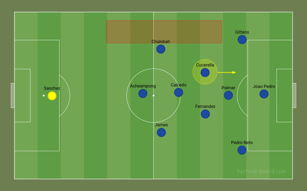 At times, Cucurella pushes even further up the pitch, joining in with their front line, inverted centrally and playing to the inside of Gittens.