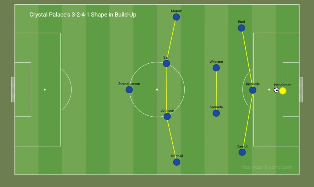 When building out from the back, Palace initially retain their 3-4-2-1 structure, often dropping their central midfielders deeper to assist in ball progression while pushing their wingbacks higher up the pitch. At times, this build-up resembles more of a 3-2-4-1 shape.