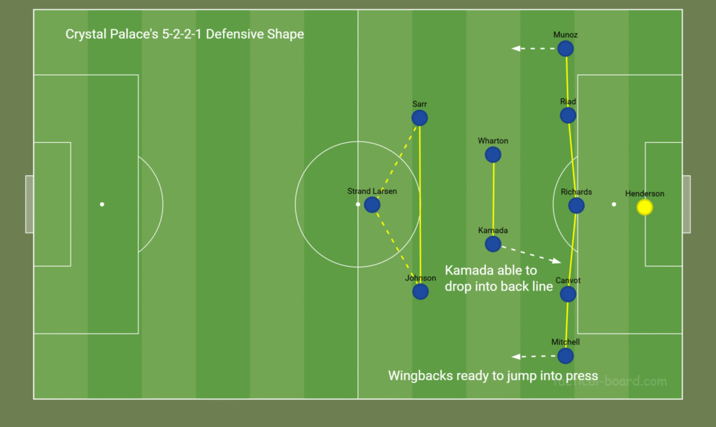 Out of possession, Crystal Palace shift from their 3-4-2-1 into either a 5-2-2-1 or a 5-2-3 shape. Their wingbacks, Daniel Muñoz and Tyrick Mitchell, are proactive in stepping out of the defensive line to press opposition fullbacks or wingbacks in wide areas. Kamada is prepared to drop deeper when necessary to cover gaps created by opposition movement. Palace also maintain a narrow structure in front of their back line, aiming to congest central midfield areas and make themselves difficult to break down.