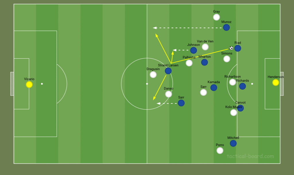 Overloading and utilizing the outside channels could force Palace to shift laterally, dragging players out of position and creating space either centrally, in the half-spaces, or on the far side of the attack.
