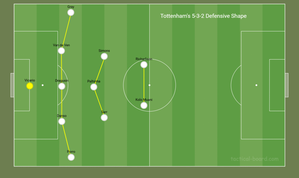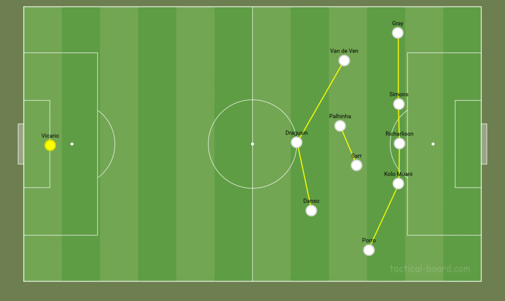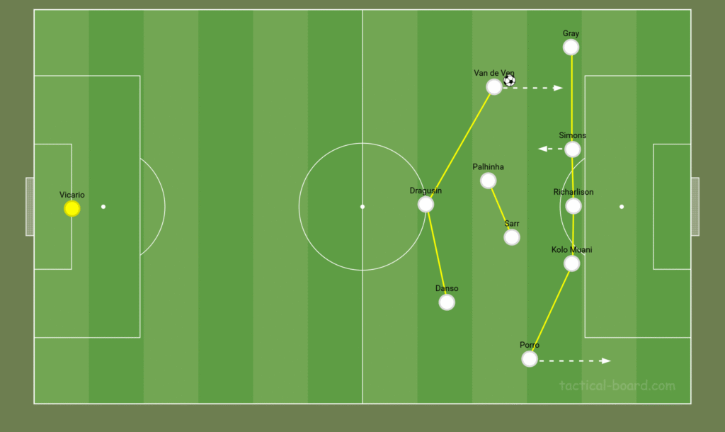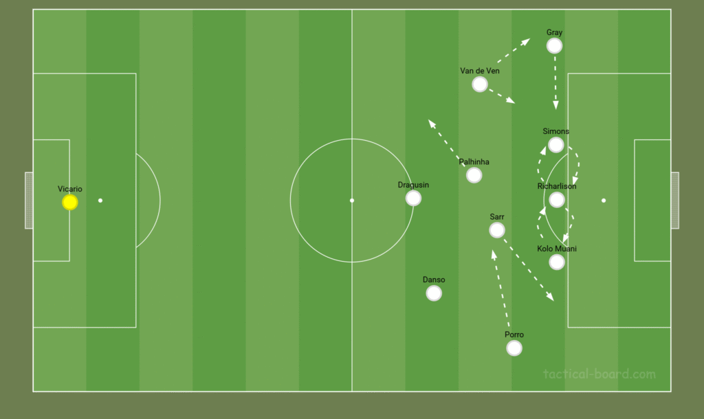 Pedro Porro is likely to operate from a slightly deeper position on the right flank, with the option to advance and provide width when required. His deeper positioning allows the outside centre-back on his side to remain more compact and central, which in turn permits the central defender to shift across and create space for van de Ven to advance.