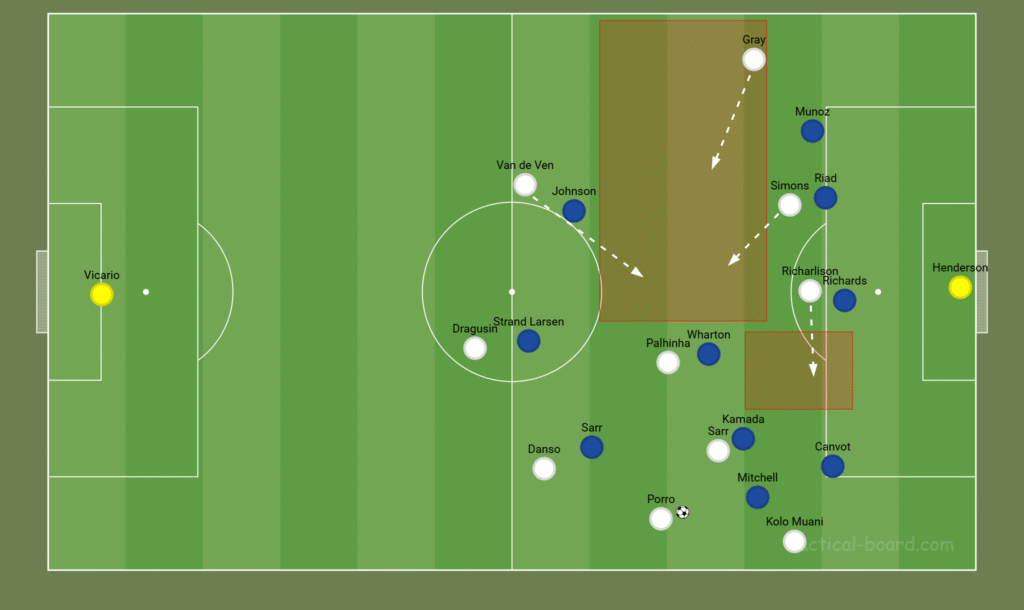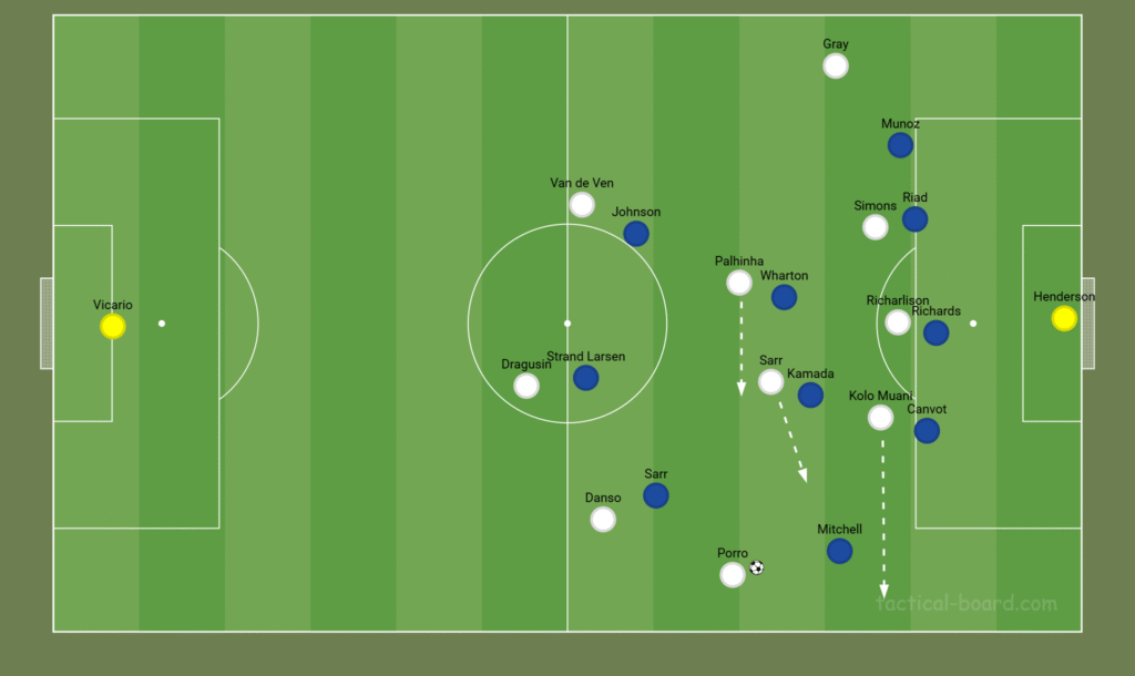 Winning the ball off a turnover, especially with van de Ven up the pitch, will open many doors for Crystal Palace on the counter. Strand Larsen can again be used in these scenarios to hold up play and pick an option flying forward.
