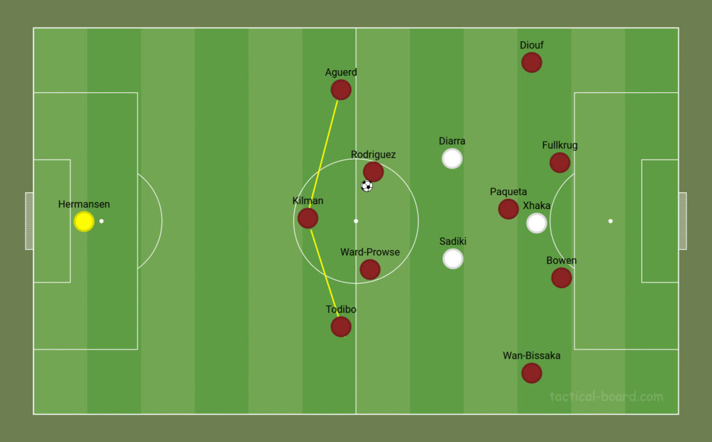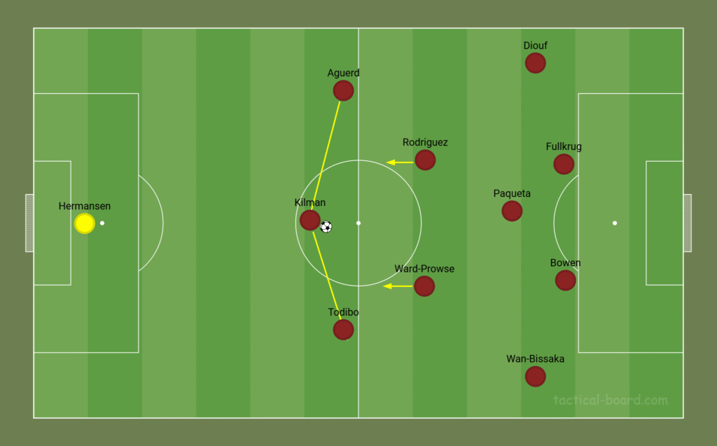 Graham Potter’s side found little success in trying to unlock that defensive setup. Despite holding the majority of possession (63%–37%), West Ham rarely turned it into meaningful chances. Much of their play consisted of defenders exchanging passes while the midfield pivots dropped deeper and deeper to collect the ball. Instead of creating progressive options, this only allowed Sunderland to maintain their numerical advantage in midfield, with West Ham’s pivots often receiving possession while Sunderland’s midfield remained firmly set in shape behind them (see images below).
